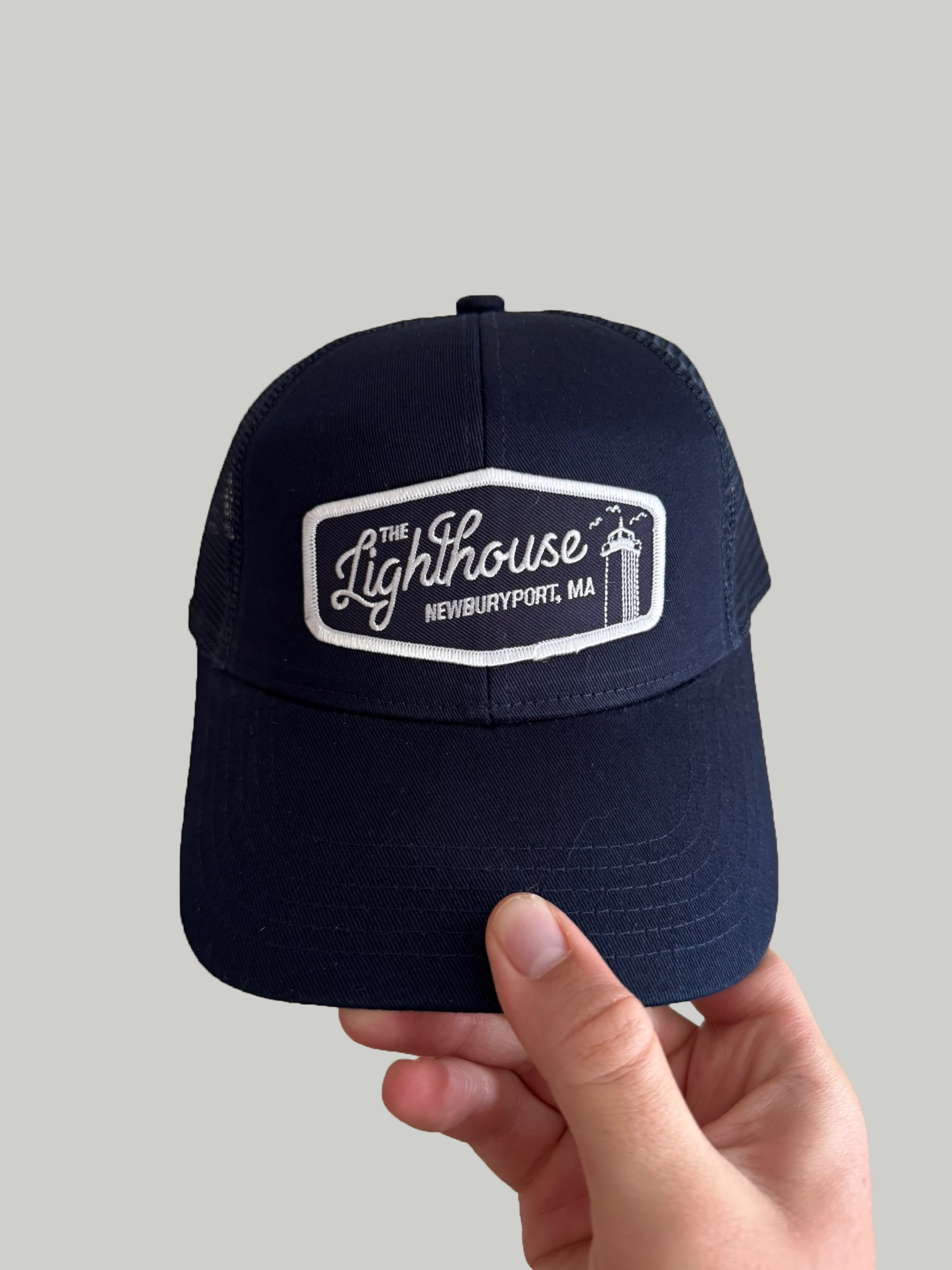 Newburyport Lighthouse hat with or without mesh back. Embroidered logo patch is sewed on for years of future wears! Adjustable clasp for the perfect fit.